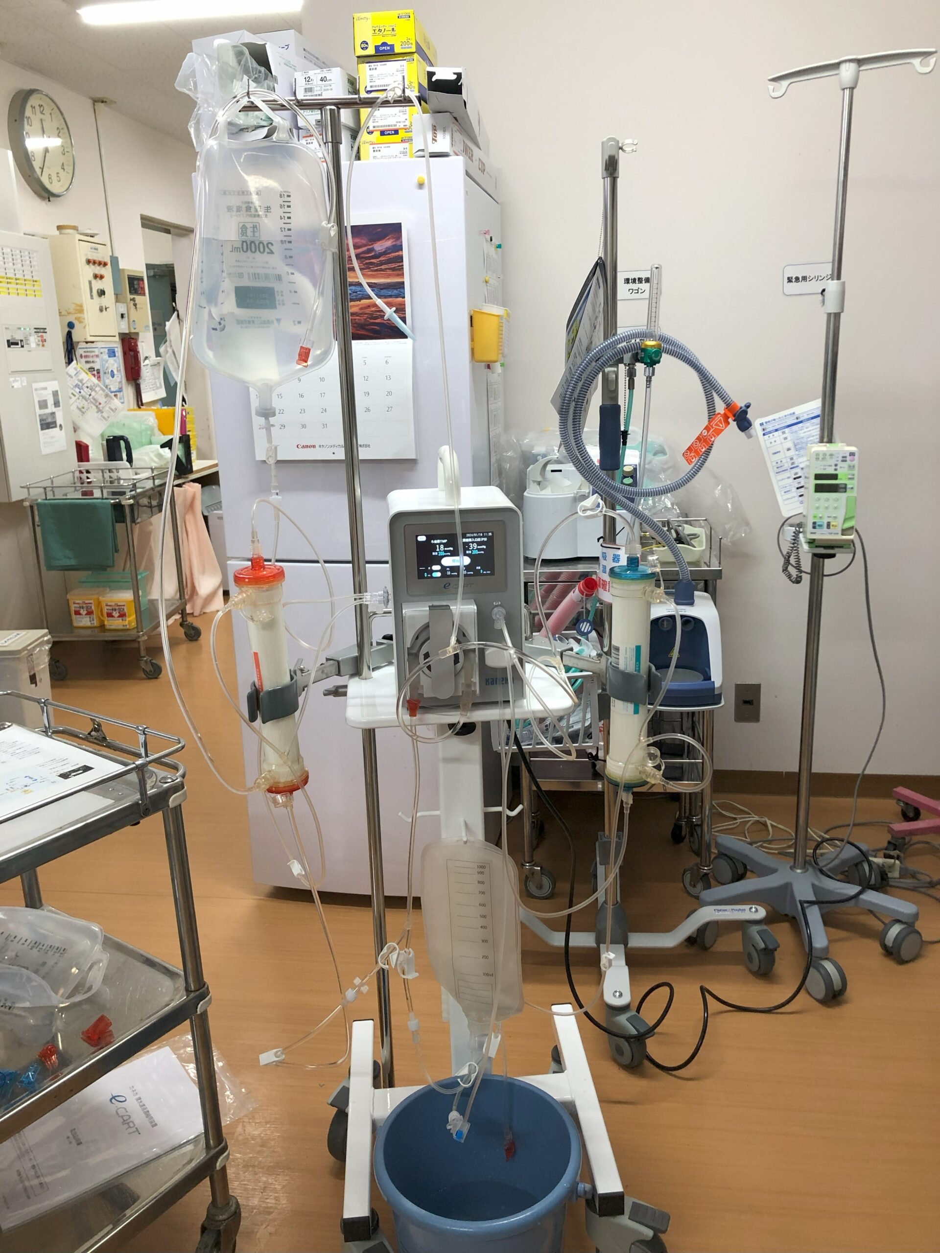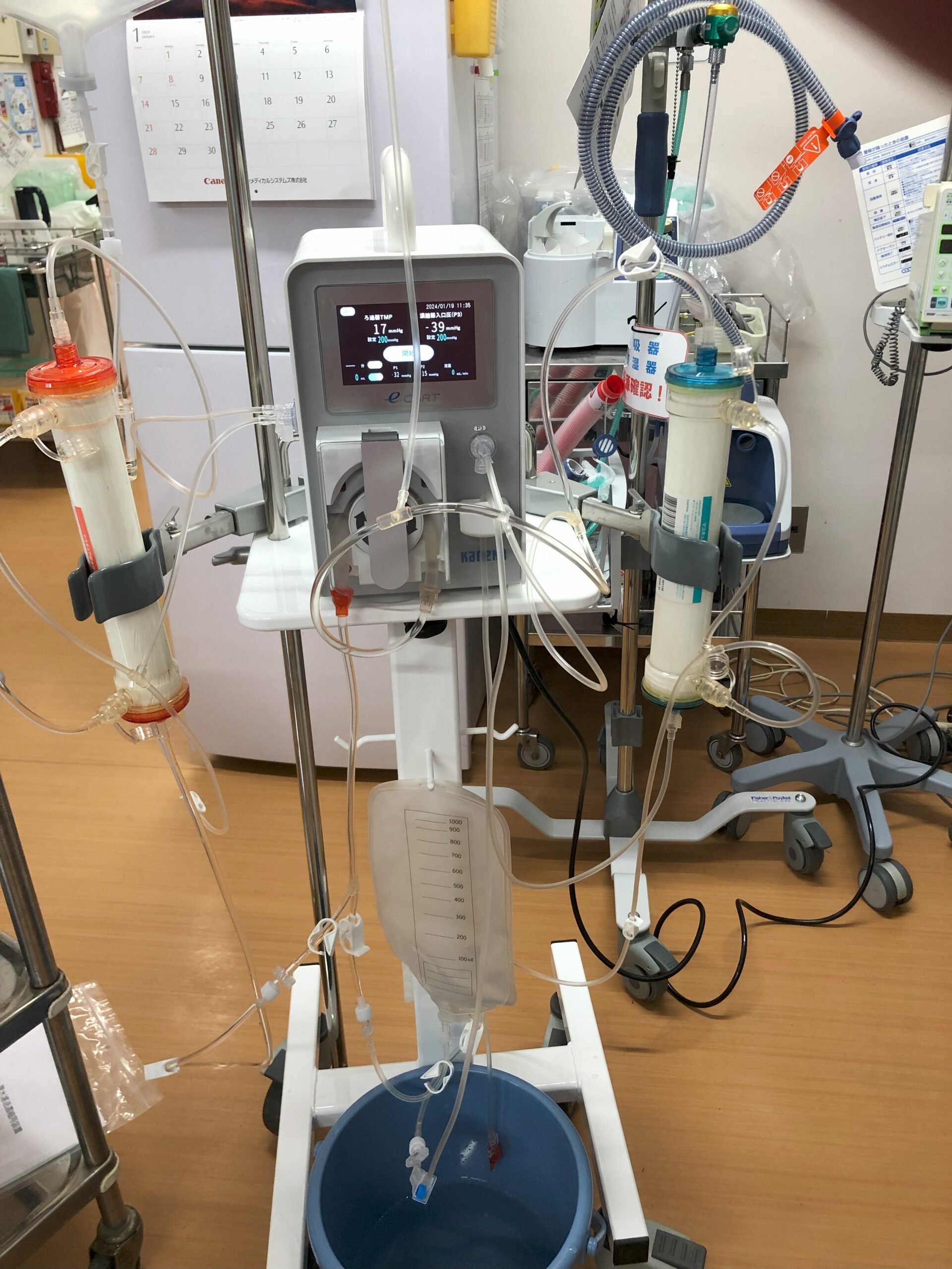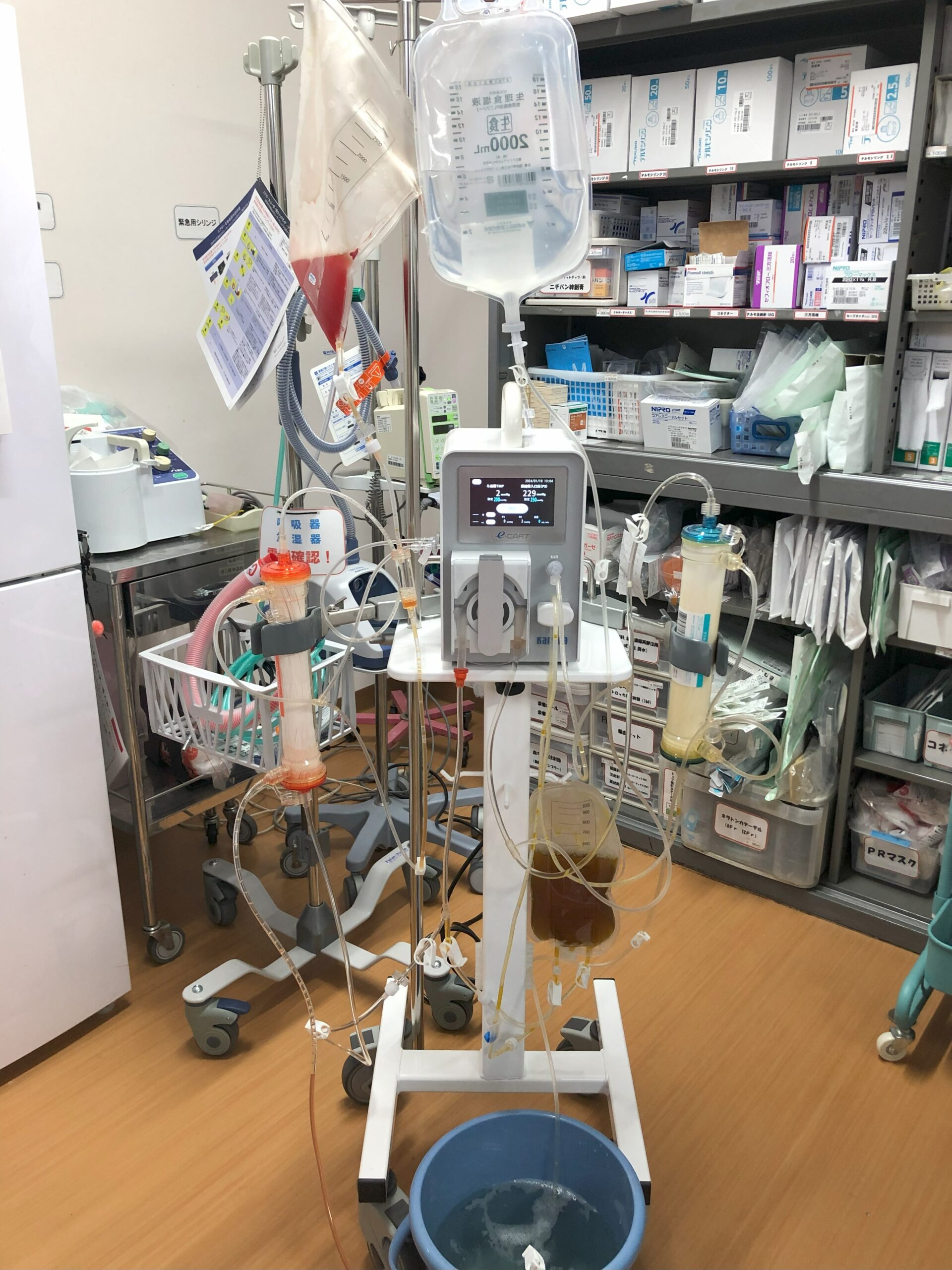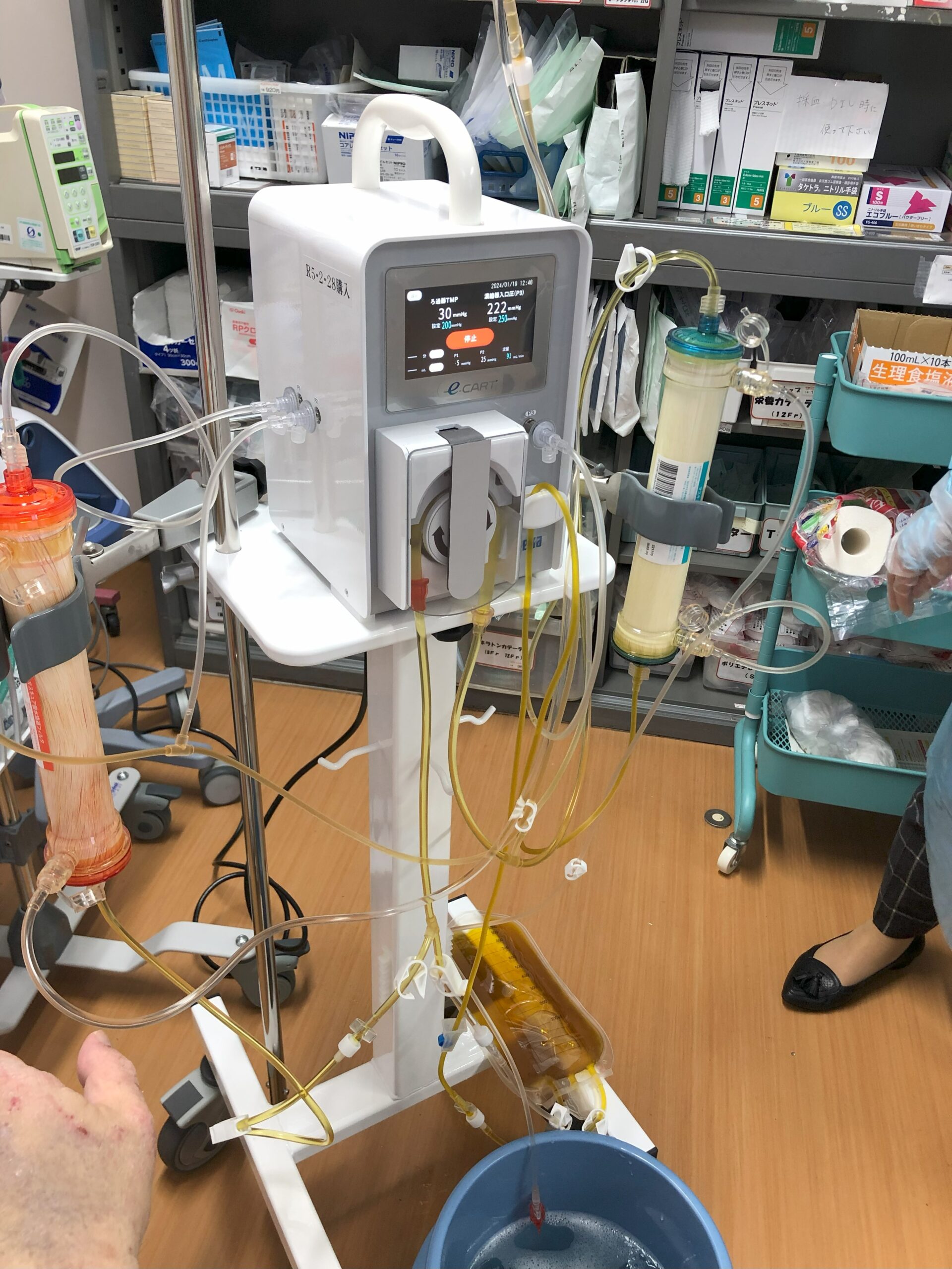 e-CART専用の貯留バッグにためた腹水から、細菌、がん細胞や血球成分をとりのぞき、アルブミンなどの有用成分を濃縮する操作を行います。