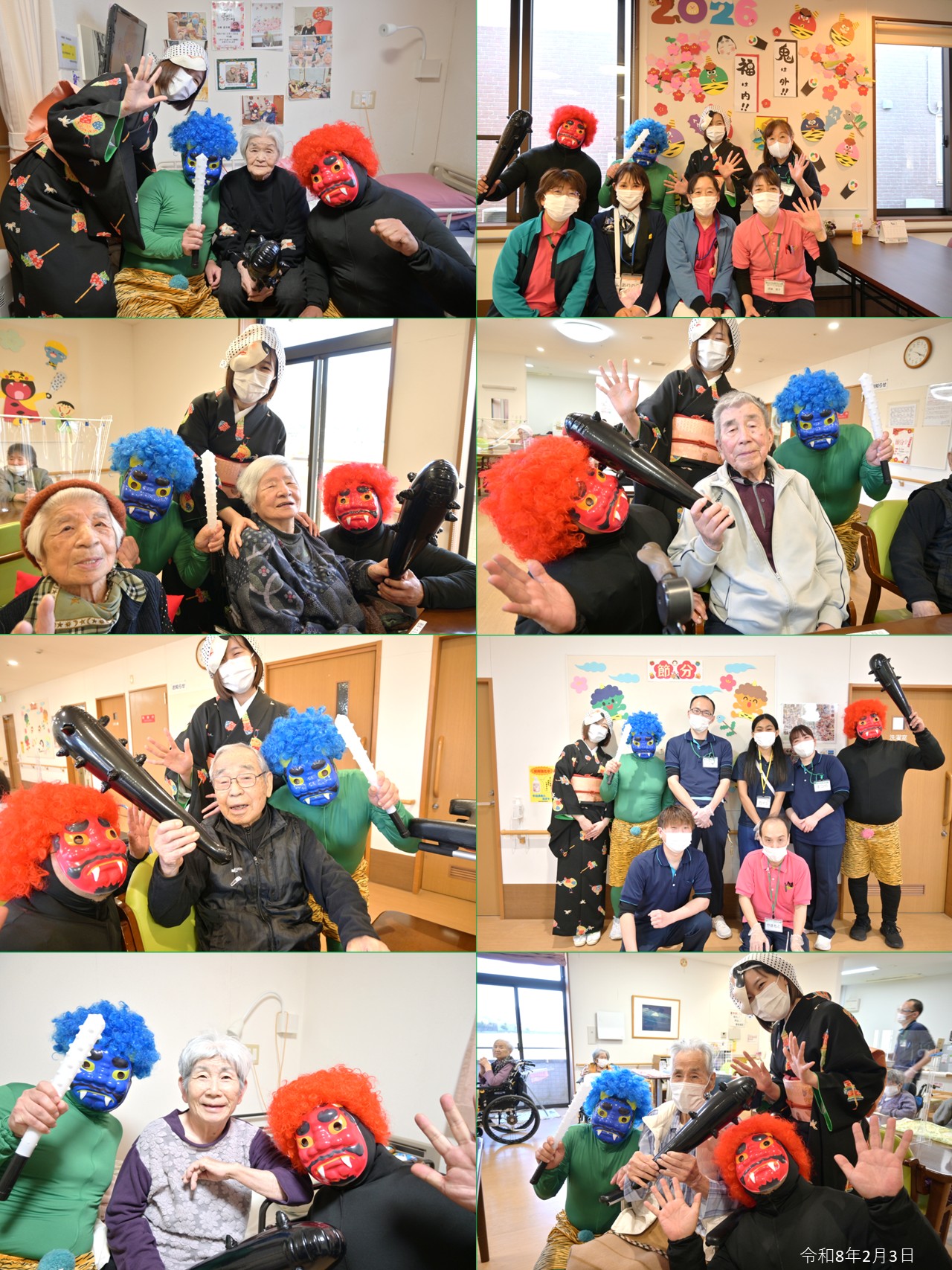 節分を何かと勘違いしている「鬼たち」が和楽苑にやってきました。びっくりさせに来たようでしたが、ちゃっかり記念撮影をして帰っていきました。