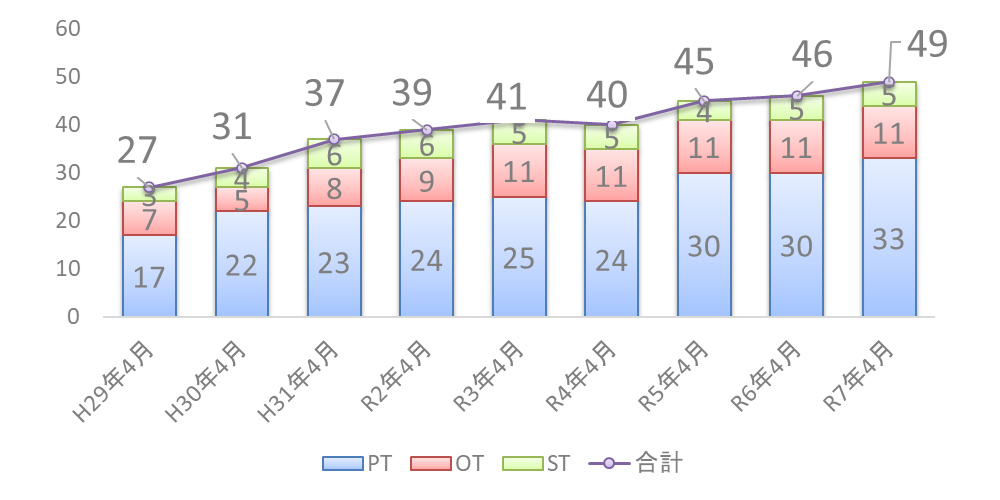 年々、リハビリスタッフを増員し、サービス拡大を図っています